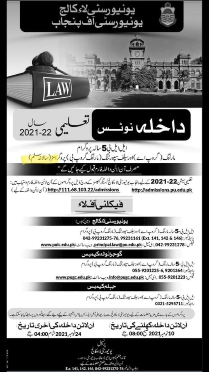 Admission Notice of LL.B. 5 Year Programes (Regular Morning & Self Supporting Morning) Session 2021-2022.